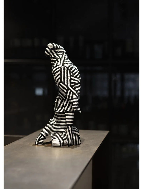 Porcelánová socha ara zdobená technikou oslnivé malby s tlustými černobílými pruhy. Ručně vyráběné ve Španělsku.