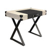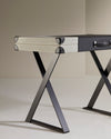 Horní část stolu je inspirována vintage cestovními kufry. Podšívka z reliéfní přírodní kůže dostupná ve více než 40 barvách a svršek z hladké ekokůže v široké škále odstínů. Pečlivě propracované, jako jsou kožené chrániče rohů zakončené připínáčky nebo rukojeť ve tvaru koženého řemínku. Má diskrétní centrální zásuvku na základní psací sadu. Základ je tvořen dvěma kovovými nohami ve tvaru kříže, pro které doporučujeme standardní texturovanou černou povrchovou úpravu.