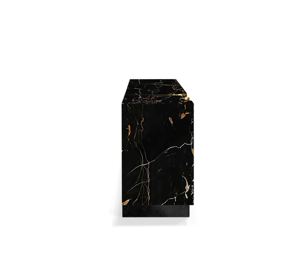 Portoro marble with hammered polished brass exterior. Wood structure. Interior: wood veneer, polished brass, glass (4 doors and 1 drawers). Base: Polished Brass