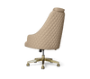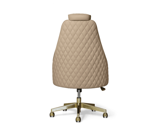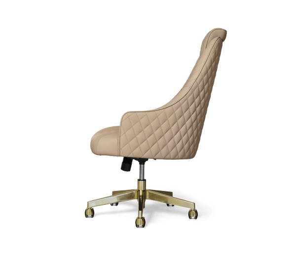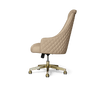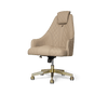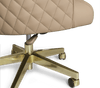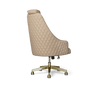 High back, seat shaped and padded for comfort, curved armrests. Upholstered in high-quality leather with three different effects. The chair can rotate 360 degrees. It is equipped with a height adjustment mechanism. Five-arm base made of polished brass on black smooth rolling wheels.