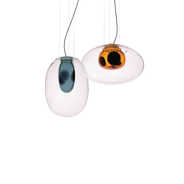 The DOT. luminaire embodies a closed world of hand-shaped glass, brought to life by a special technique of layered colors. Its form is born and transformed from the very first breaths into the glassmaker’s pipe, through the coloring of the inner element using optical lenses, up to the final shaping in the hands of the glassmaker. The light is ingeniously embedded within the heart of the object, carefully protected by the outer glass layer, opening an entirely new dimension to the pure material.
