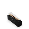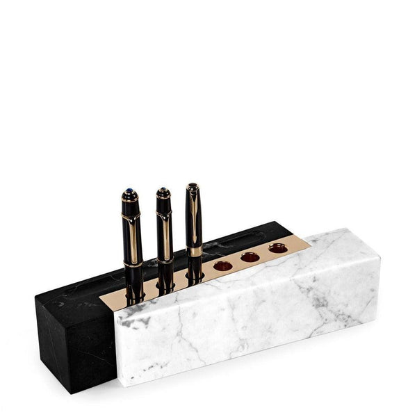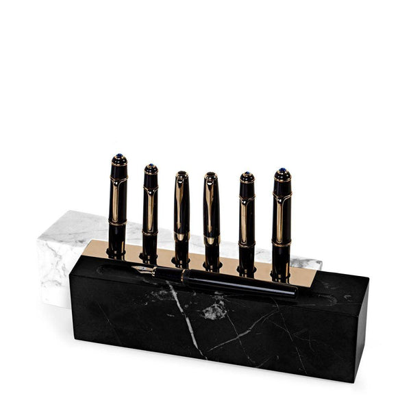 Contrasting geometric blocks of Carrara and Negro Marquina marble are joined and feature horizontal fittings for a single pen, further surmounted by six vertical gilded brass pen holders that form the basis of the artwork.