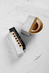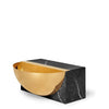 The main gilded brass quarter-sphere is placed next to a rectangular block of Carrara or Negro Marquina marble, creating a surprising contrast between boldness and calm.