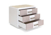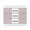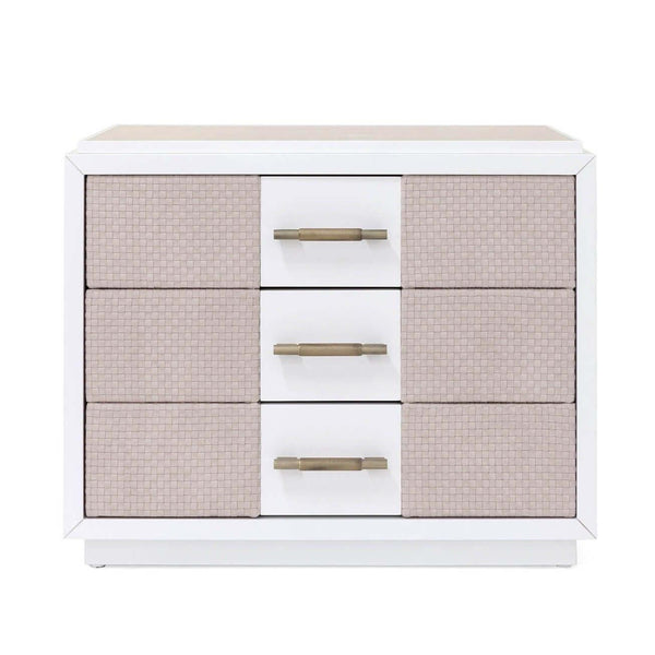 This elegant bedside table has three drawers with beautiful Italian antique brass handles and provides storage space in the bedroom or living room. Aaron boasts flawlessly upholstered detailing on the front of the drawers and a customizable glass finish on the top.