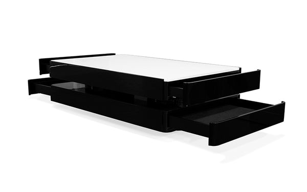 A Shinto shrine is a structure whose main purpose is to guard one or more "kami" or gods. Its most important part is the chamber, which is used to store sacred objects. The SHINTO round center table has a glossy black lacquered structure and a gray mirror table top. Place this round black center table in any living room setup and watch it become the main focal point.