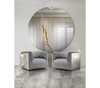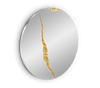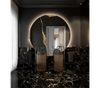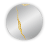 Wooden structure with a mirror surface formed by two polished stainless steel plates in a circular shape, divided by a sheet of hammered polished brass. An LED light strip illuminates the entire perimeter.