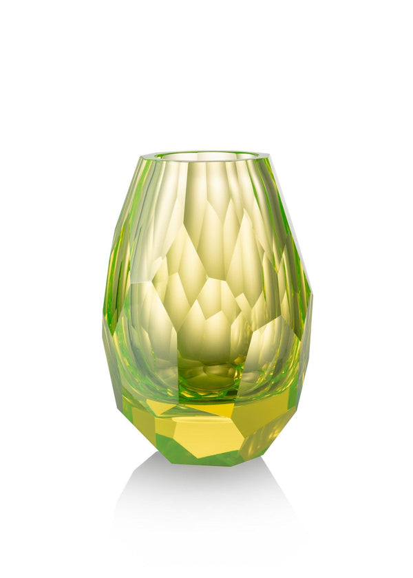 The Citrine design cut vase is hand blown into wooden beech moulds. Its wall strength is massive, so that subsequent grinding into large, deep surfaces will bring out the timeless cubist geometry and the glow of the unique uranium enamel. The vase will light up any interior with its soft, bright color.