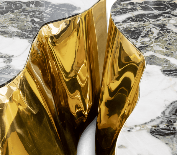 Lapiaz center table takes exceptional craftsmanship and design to a new realm. Finding beauty in the most unexpected places, this contemporary design piece is inspired by authentic karst formations. Its organic features are achieved through the manual fitting of the polished brass sheet, and a sharp exterior finished in polished stainless steel that portrays a perfect mirror. The hammered brass details and mirrored sides conveys both dynamics and elegance, a beautiful duality between power and refinement to bring a new contemporary verve into interior design. A functional artwork conceived in three modules for unexpected combinations. Born from cold and freshly cracked to showing off the world rich, golden interior.
