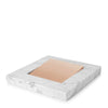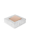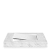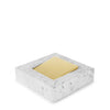 A square plinth of Carrara marble provides weight to the piece, gently supporting its central polished brass plate, available in yellow gold, rose gold or silver plated.