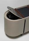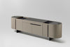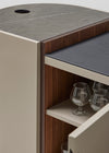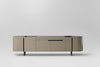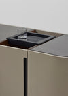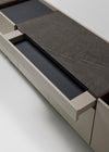 The top of the sideboard combines porcelain and eco-leather sections at different heights. The lacquered body has leather details on the door handles. The legs are in metal finished in satin black. It can be personalised in a wide range of options.