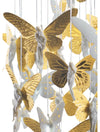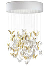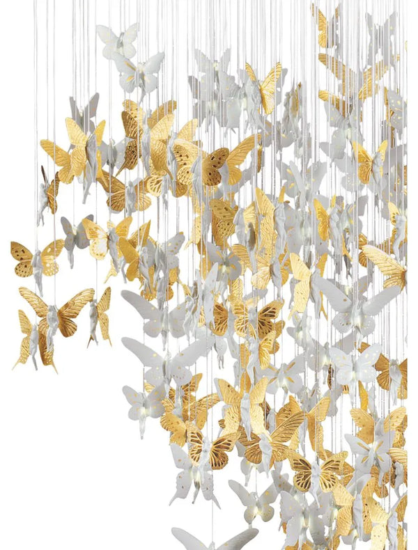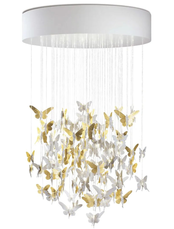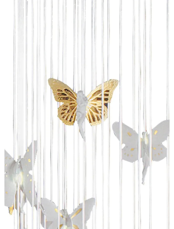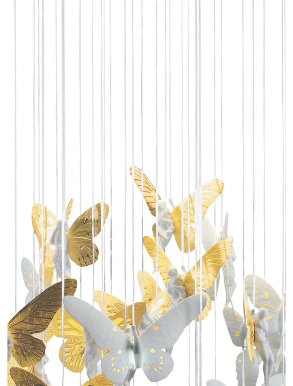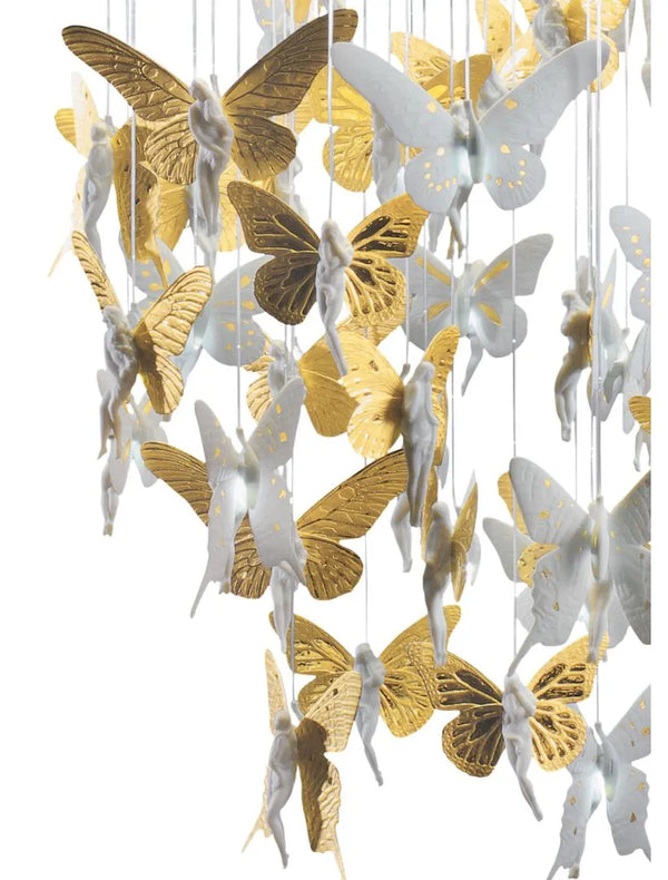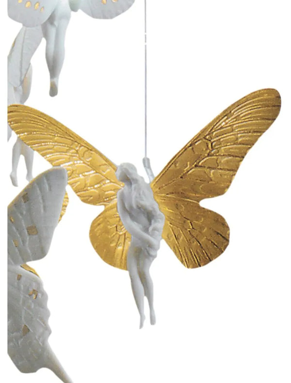 The ceiling lamp, with handmade white matte porcelain fairies and golden shine, was designed by Bodo Sperlein.