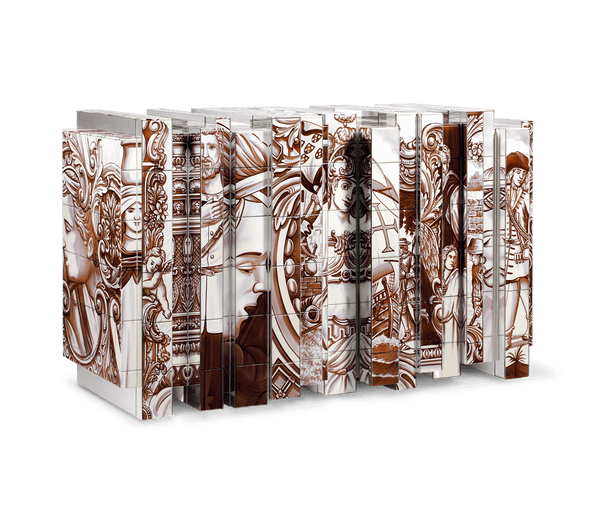 The Heritage Sideboard is a magnificent journey through Portuguese legacy. Covered in Azulejos, traditional hand painted tiles and one of the most representative art forms of Portuguese culture, the architectural sideboard portrays different scenes from the country’s Discoveries era. Centuries of history are gathered in a single final panel, and each layer is enhanced by vertical mirrors on the lateral surfaces. The hint of wander through the rich legacy continues when two door open to a lined glossy gold leaf interior, and a classical ornament trim reminds the inside of churches and rich buildings. A clear glass shelve can be seen on the two individual divisions of the sideboard. A statement sideboard, the Heritage can take center stage in the most elegant rooms since its back is also fully hand painted. A lengthy tradition of bespoke and exclusivity to make one-of-kind design pieces.
