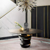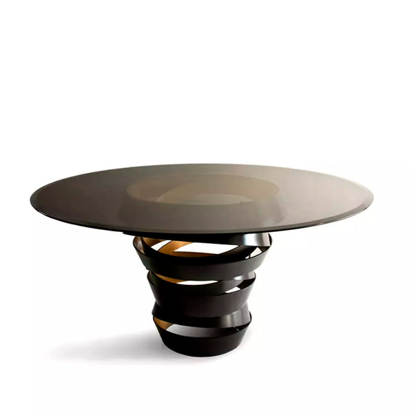 The swirling metal ribbon of the Intuition dining table evokes the mysterious and divine feminine instinct. Carefree and unexpected swirls are guided by emotions and desires. The two-tone metal base is topped with a perfect glass circle top. Without this, there is nothing.