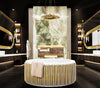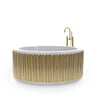 The well-thought-out patinated iron bathtub has an oval shape and a curved edge, making it the perfect place to rest your head.